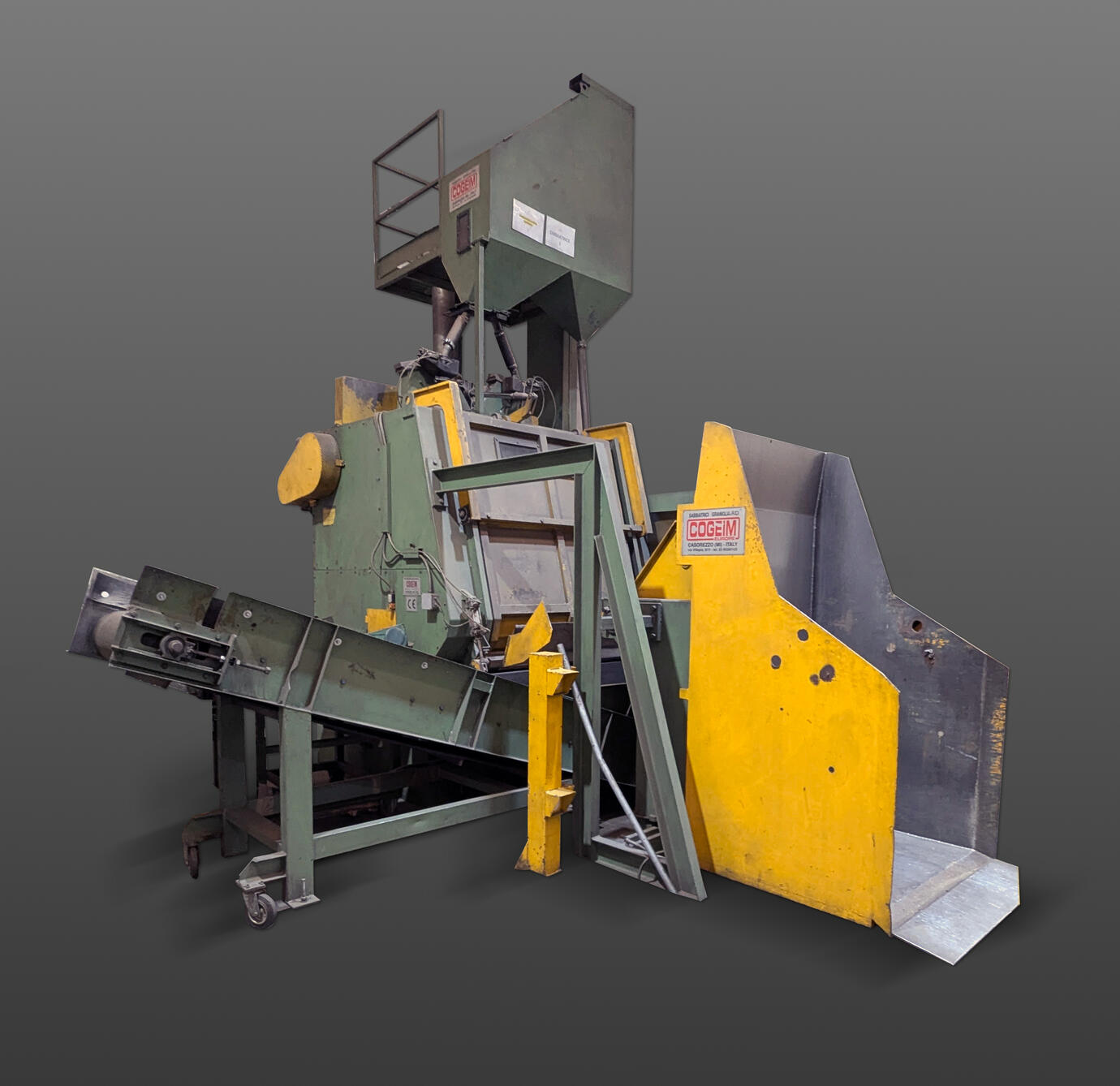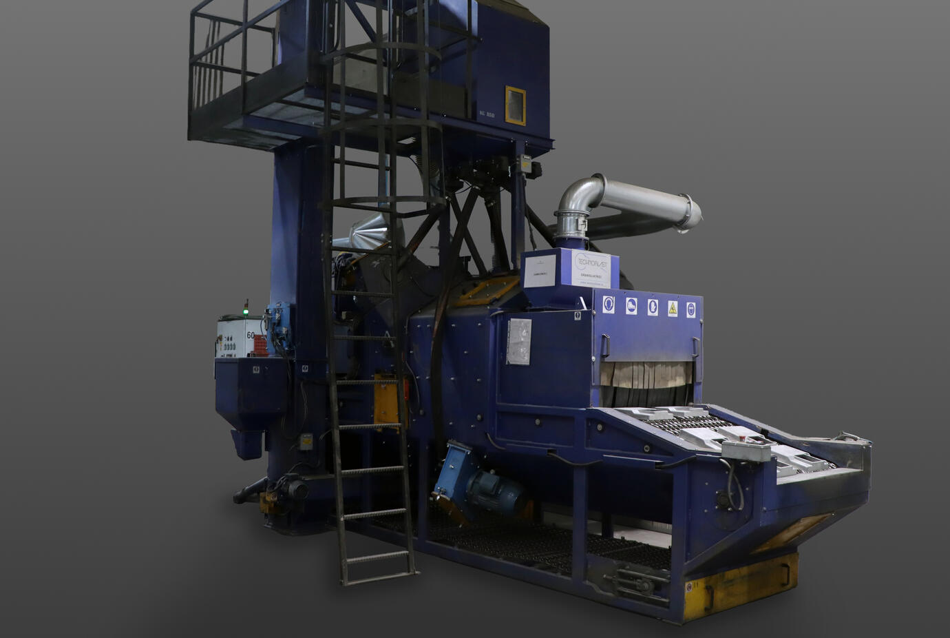 The complete cycle—loading, shot blasting with automatic abrasive recovery via magnetic/cyclonic separator, and automatic unloading through belt reversal—is PLC-controlled. It enables the processing of batches ranging from 200 kg to 3.5 tons/hour, ensuring the removal of burrs, foundry sand, oxides, and scale from iron castings, pressings, and forgings made of cast iron, steel, and aluminum. The tumbling movement provides the advantage of full, omnidirectional coverage of complex geometries, unlike continuous conveyor belts where parts remain static.
